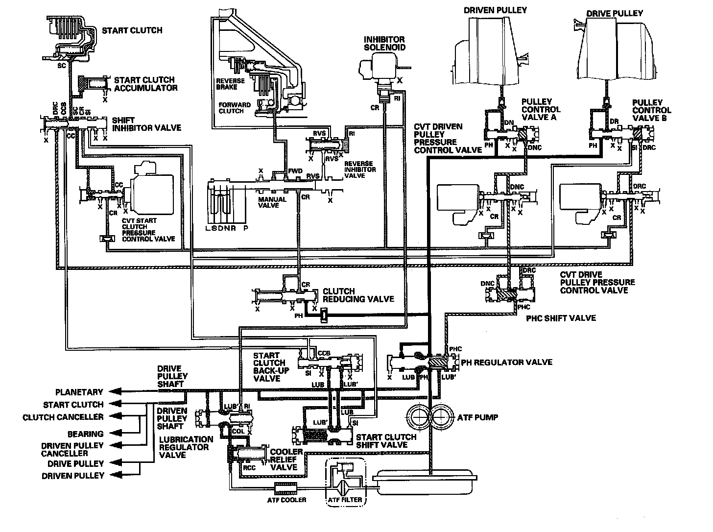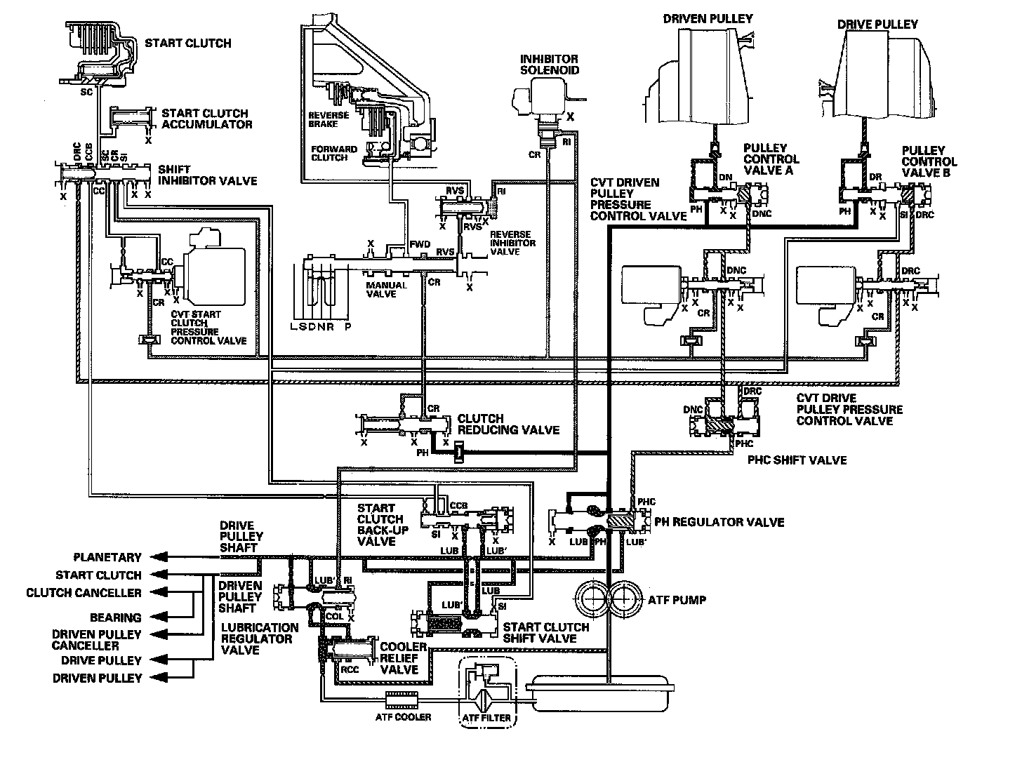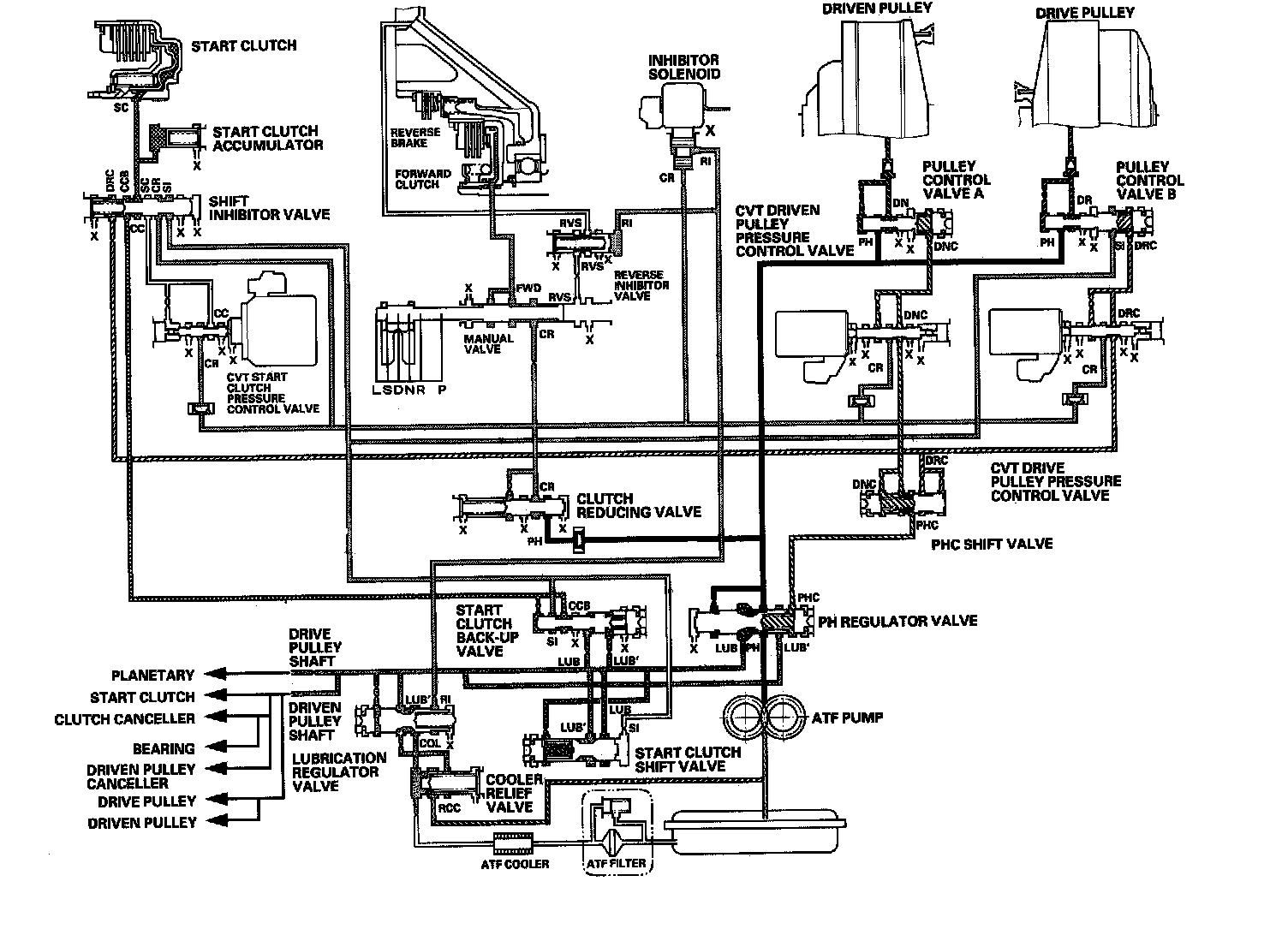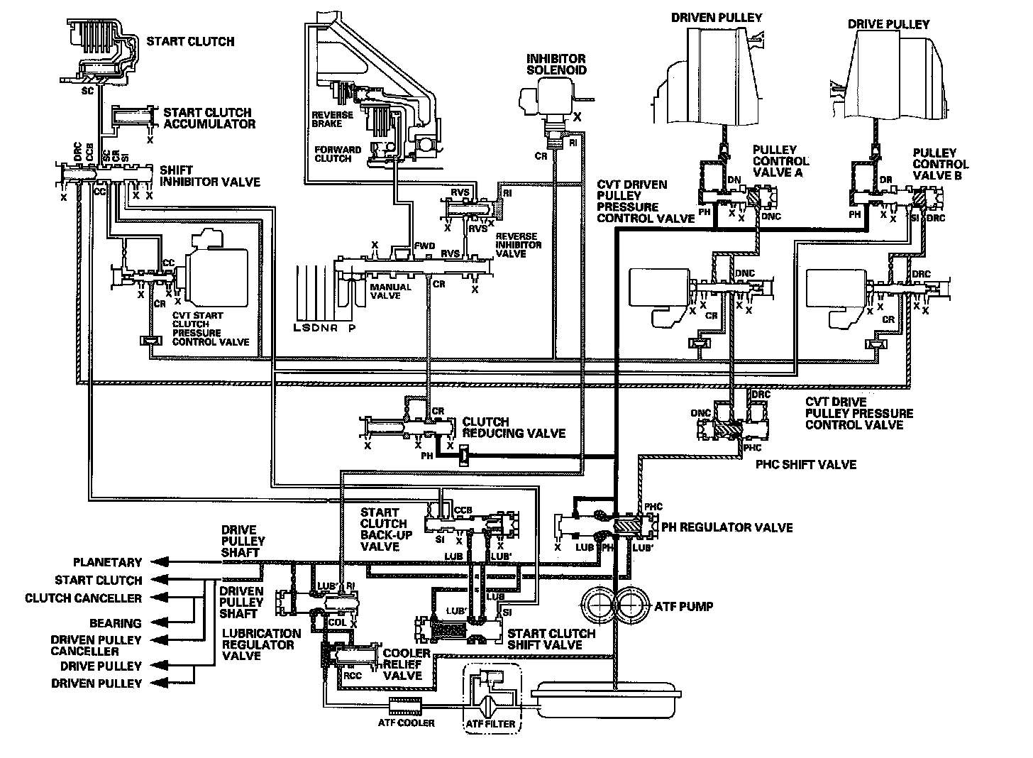 Fluid from the ATF pump is regulated to high pressure at the PH regulator valve, and flows to the pulley control valves. The CVT driven pulley pressure control valve and the CVT drive pulley pressure control valve control pulley control valves A and B to apply pressure to the pulleys. The driven pulley receives pressure higher than the pressure drive pulley receives, but hydraulic pressure to the forward clutch is intercepted by the manual valve and to the start clutch is intercepted by the CVT start clutch pressure control valve. Under this condition, hydraulic pressure is not applied to the start and forward clutches.