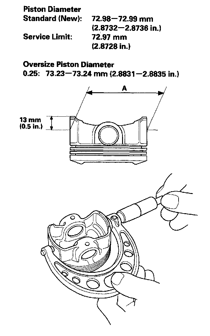3. Measure the piston diameter (A) at a point 13 mm (0.5 inch) from the bottom of the skirt.