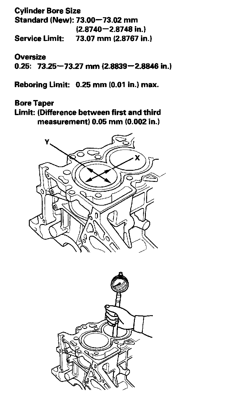 4. Measure wear and taper in direction X and Y at three levels in each cylinder as shown. If measurements in any cylinder are beyond the Oversize Bore Service Limit, replace the engine block. If the engine block is to be rebored, refer to step 7 after reboring.