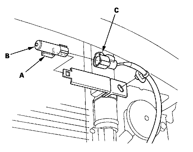 2. Lift the tab (A) to release the lock, then remove the outside air temperature sensor (B) from the receiver/dryer desiccant bracket. Disconnect the 2P connector (C) from the outside air temperature sensor.