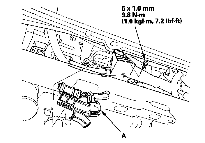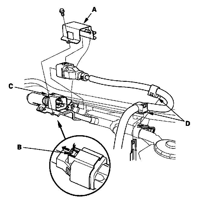 8. Remove the bolt and the shield connector cover (A). Slide the retainer (B), then disconnect the connector (C). Remove the wire harness clips (D).