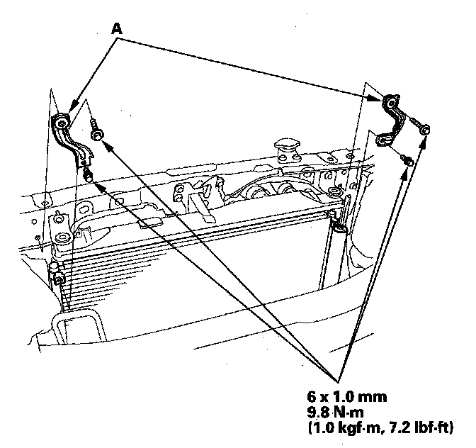 5. Remove the bolts and the A/C condenser upper mount brackets (A).