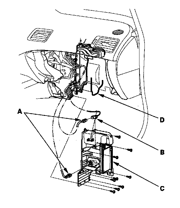 6. Disconnect the connectors (A) from the evaporator temperature sensor and the power transistor, then remove the connector clip (B). Remove the self-tapping screws, the expansion valve cover (C), and the seal (D).