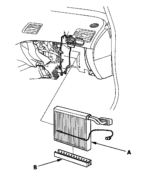 7. Carefully pull out the evaporator core (A) without bending the lines, then remove the plate (B).