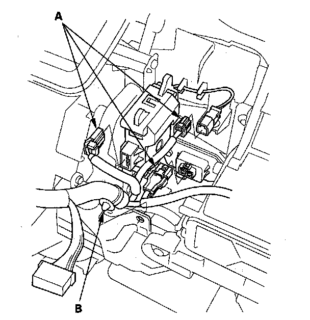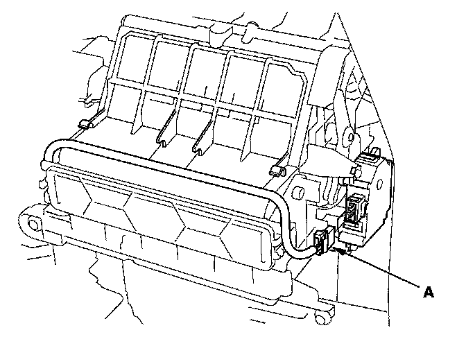 12. Disconnect the connectors (A) from the mode control motor, the evaporator temperature sensor, and the power transistor. Remove the wire harness clip(B).
