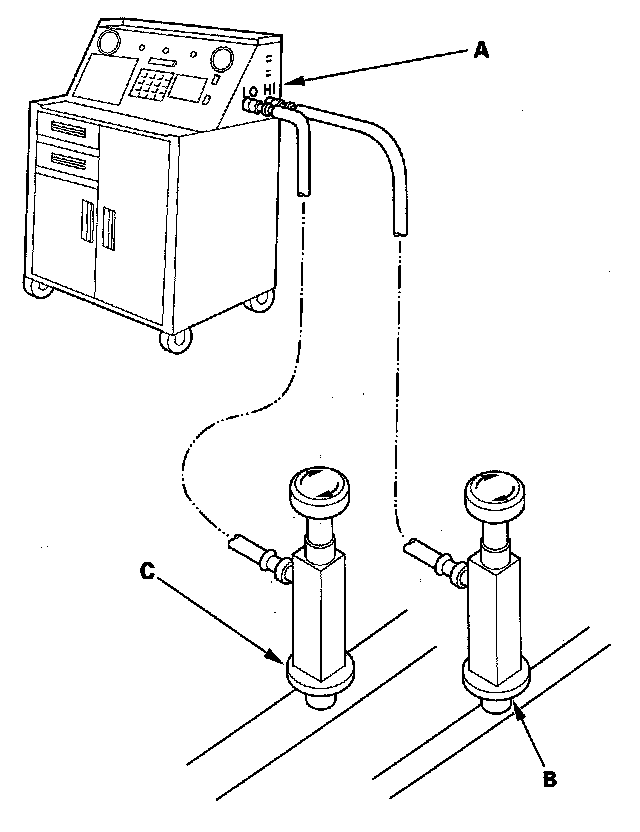 1. Connect an R-134a refrigerant recovery/recycling/charging station (A) to the high-pressure service port (B) and the low-pressure service port (C), as shown, following the equipment manufacturer's instructions.