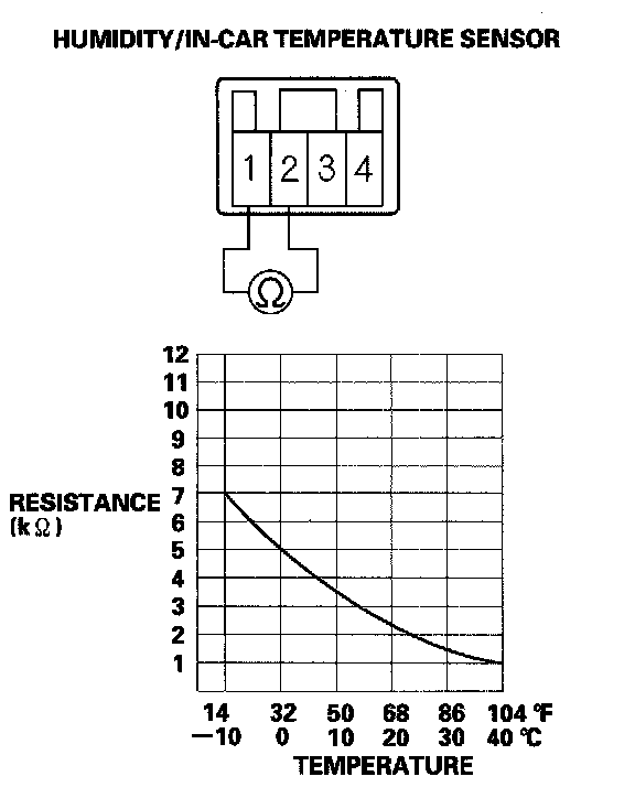 3. Compare the resistance reading between the No. 1 and No. 2 terminals of the humidity/in-car temperature sensor with the specifications shown in the graph; the resistance should be within the specifications.