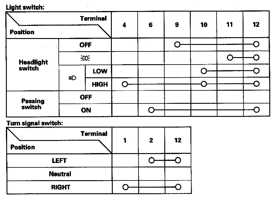 - If the terminals look OK, check for continuity between the terminals in each switch position according to the tables.