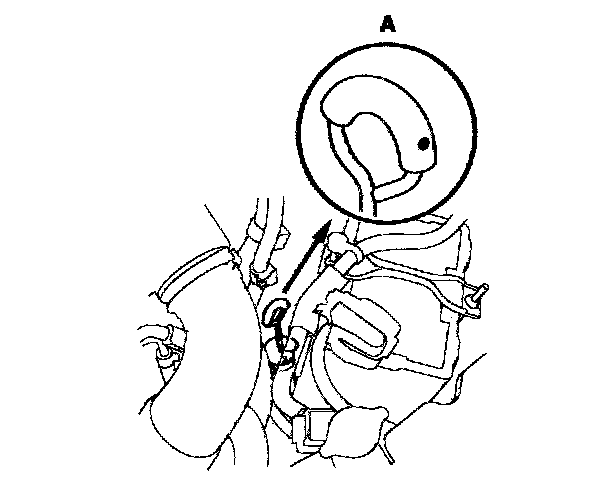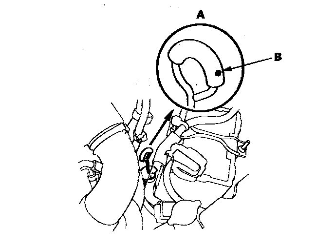 9. Insert the dipstick (A) back into the tube with the dot (B) on the handle facing to the left side of the vehicle.