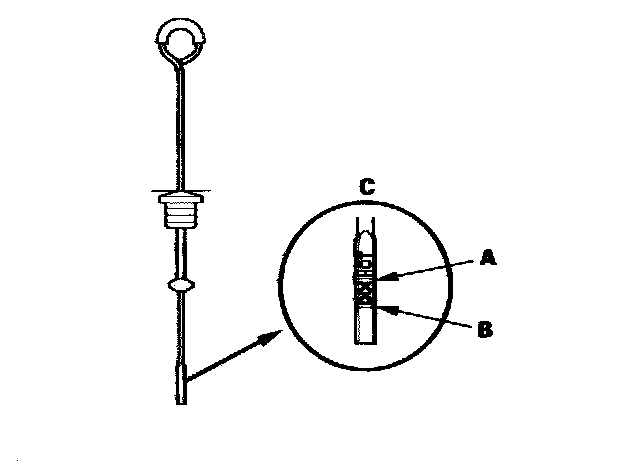 5. Remove the dipstick, and check the fluid level. It should be between upper mark (A) and lower mark (B) on the HOT level (C).