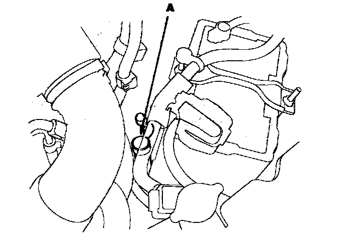 8. If necessary, fill the transmission with the recommended fluid through the dipstick tube opening (A) to bring it to the upper mark on the dipstick. Always use Honda CVT fluid (CVTF). Using a non-Honda CVTF can affect shift quality.