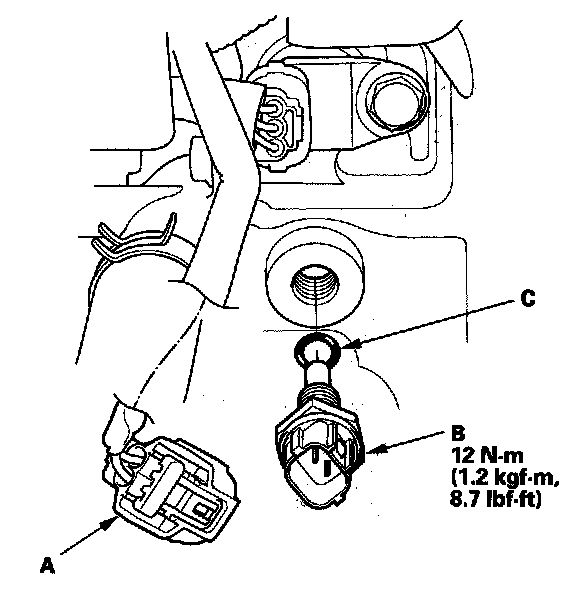5. Install the parts in the reverse order of removal with a new O-ring (C), then refill the radiator with engine coolant.