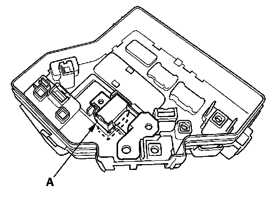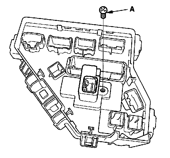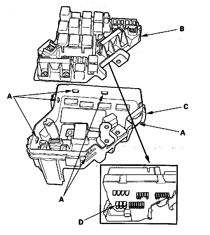 5. Turn the housing over again. Using two flat-tip screwdrivers, release the tabs (A), and pry up the fuse/relay box base (B) from the fuse/relay box housing (C).