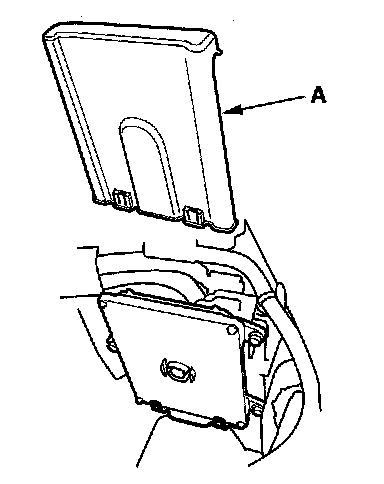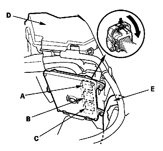 4. Remove the coolant reservoir (E). Disconnect the PCM connectors A, B, and C.