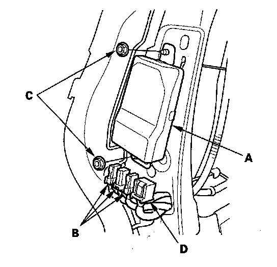 1. Place the new ODS unit (A) on the seat-back frame. Tighten the two nuts (B), and connect the ODS unit harness 18P connector (D) and sensor connectors (C) to the ODS unit.