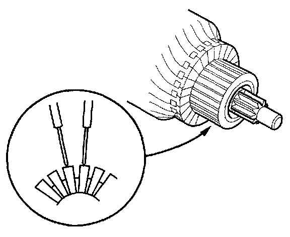 8. Check for continuity between the segments of the commutator. If there is an open circuit between any segments, replace the armature.