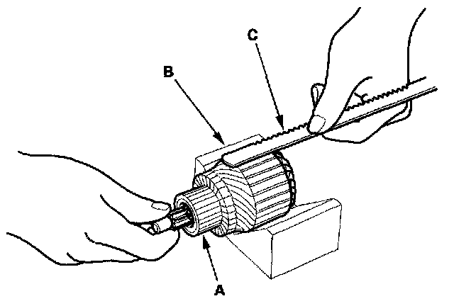 9. Place the armature (A) on an armature tester (B). Hold a hacksaw blade (C) on the armature core. If the blade is attracted to the core or vibrates while the core is turned, the armature is shorted. Replace the armature.