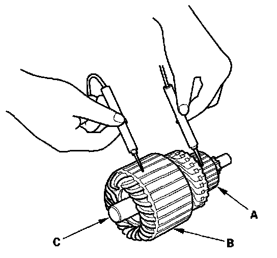 10. Check for continuity between the commutator (A) and armature coil core (B), and between the commutator and armature shaft (C). If there is continuity, replace the armature.