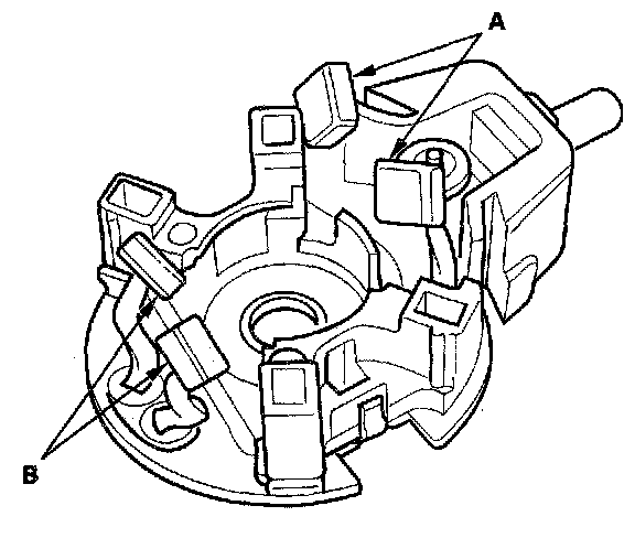 12. Check for continuity between the (+) brush (A) and (-) brush (B). If there is continuity, replace the brush holder assembly.