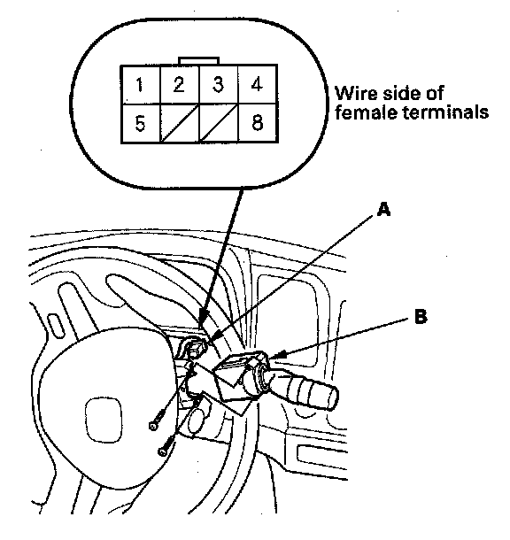 2. Disconnect the dashboard wire harness 8P connector (A) from the wiper/washer switch (B).