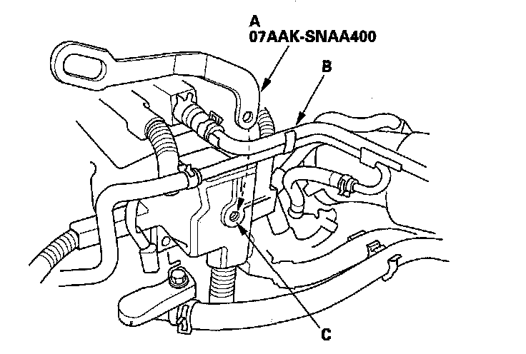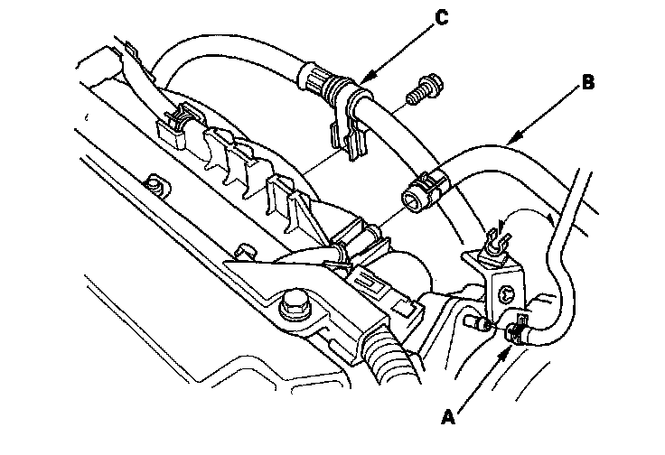 43. Install the vacuum hose (A), the brake booster vacuum hose (B), and the power steering (P/S) hose clamp (C).