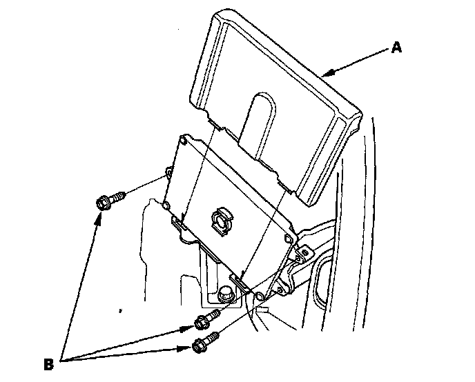13. Remove the powertrain control module (PCM) cover (A), then remove the three bolts (B) securing the PCM.