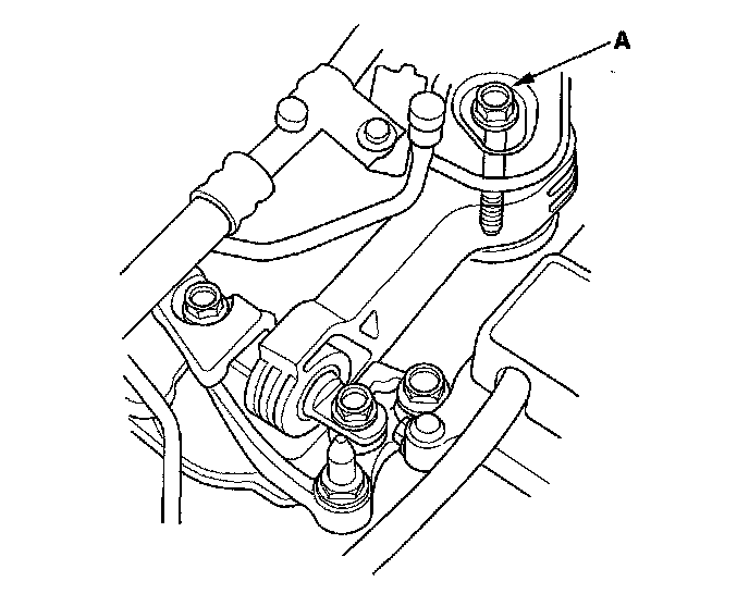 8. Tighten the new transmission mounting bolt and nuts (A).