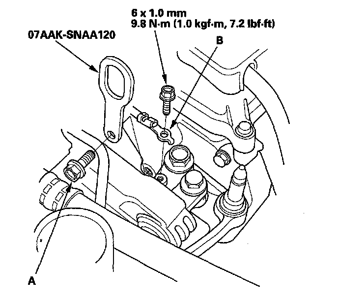 4. Attach the 1.8 support eyelet (A) to the cylinder head with the 1.8 support bolt (B). Tighten the bolt by hand.