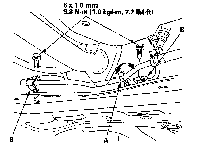 24. Install the power steering (P/S) line on the clamp (A), then install the P/S line brackets (B) on the subframe.