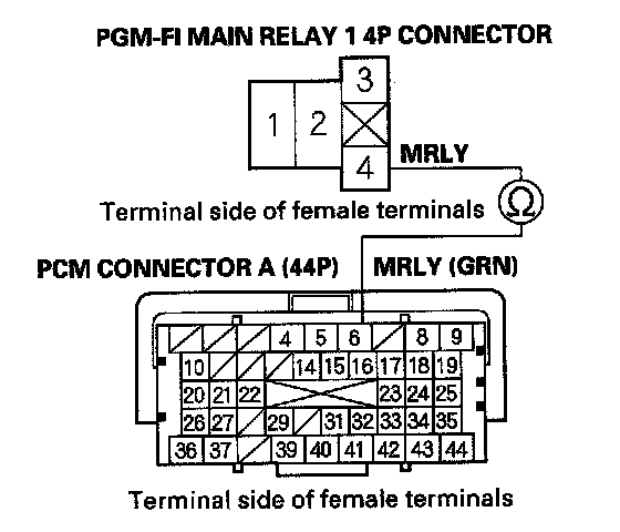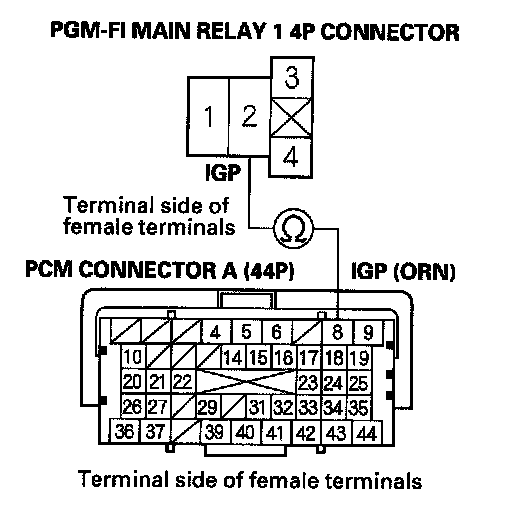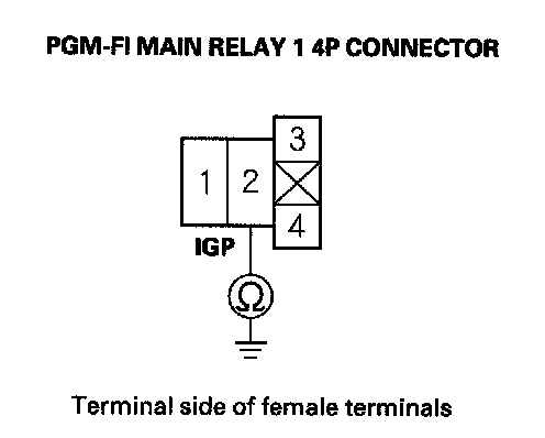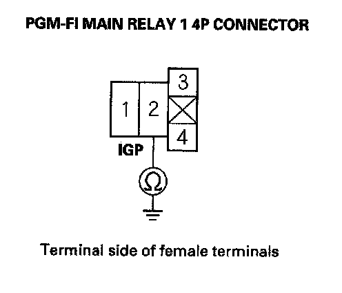 39. Check for continuity between body ground and PGM-FI main relay 1 4P connector terminals No. 1 and No. 3 individually.