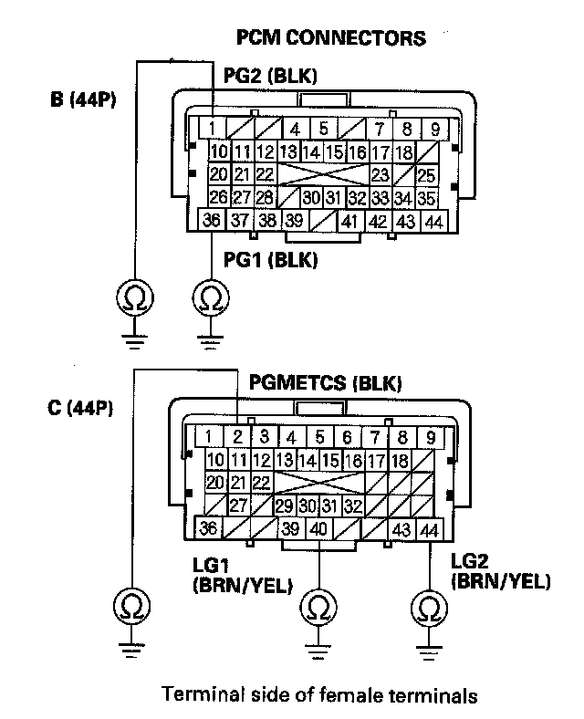 68. Check for continuity between body ground and PCM connector terminals B1, B36, C2, C40 and C44 individually.