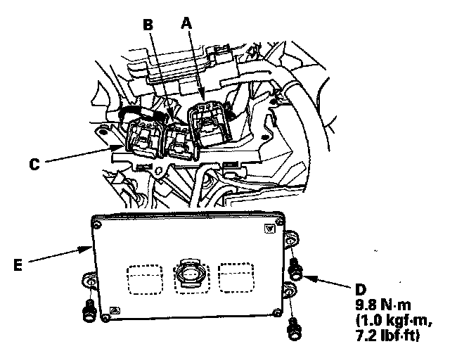 NOTE: PCM connectors A, B, and C have symbols (A=[], B=/\, C=O) embossed on them for identification.