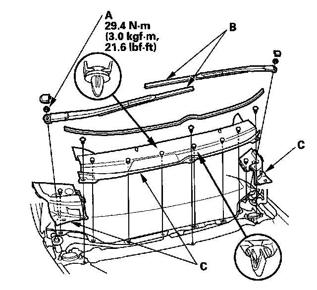 7. Remove the three bolts, and separate the windshield wiper linkage from the wiper motor (F).