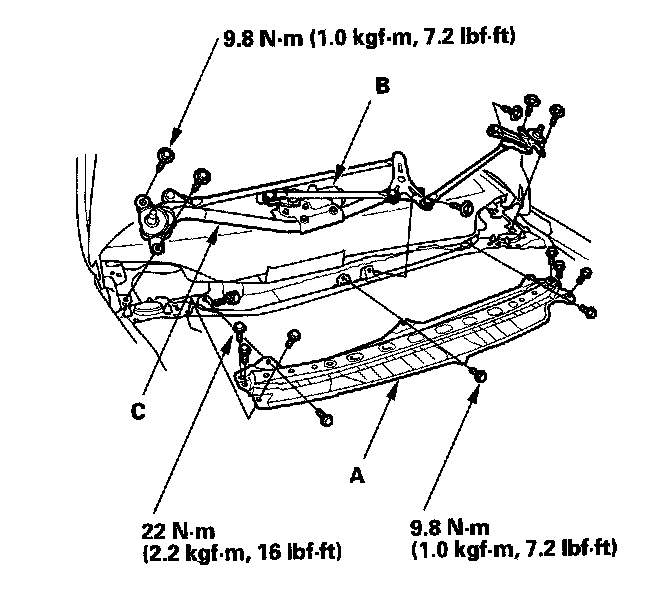 4. Disconnect the 5P connector from the wiper motor (B), then remove the six bolts and wiper linkage assembly (C).