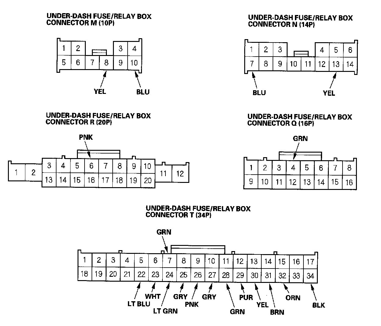 3. Disconnect the under-dash fuse/relay box connectors E, F, G, M, N, Q, R, and T.