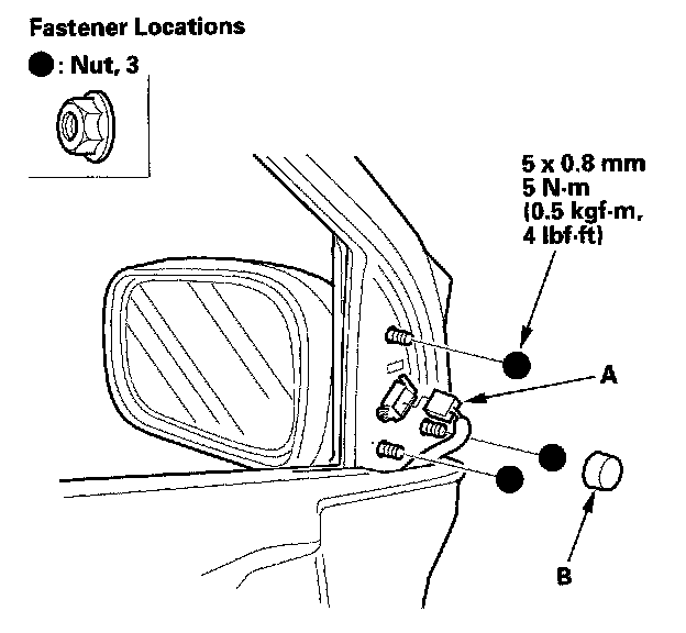 5. While holding the mirror, push in on the connector clip (A), then push out to remove the mirror (B). Take care not to scratch the door.