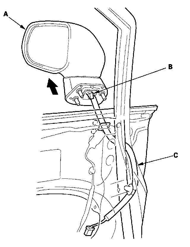 5. While holding the mirror (A), detach the clip (B), then remove the mirror, and pull the harness (C) out through the hole in the door. Take care not to scratch the door.