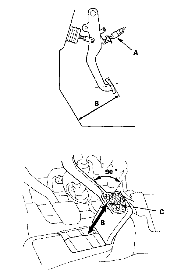 2. Pull back the carpet and find the cutout in the insulator. Lift up the insulator cutout and measure the pedal height (B) at the middle of the left side center of the pedal pad (C) to the floor.