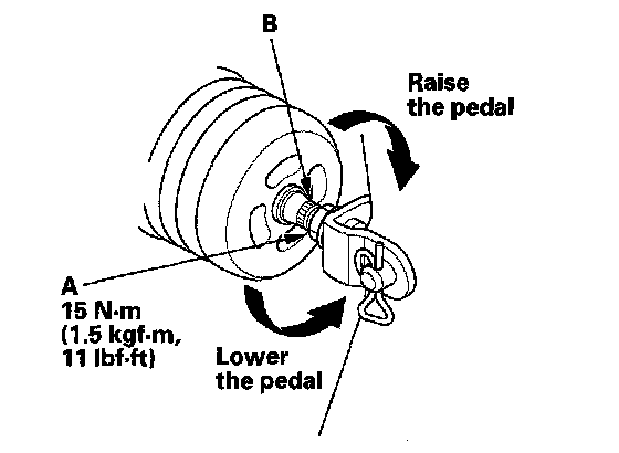 3. Loosen the push rod locknut (A), and screw the pushrod (B) in or out with pliers until the standard pedal height from the floor is reached. After adjustment, tighten the locknut firmly. Do not adjust the pedal height with the pushrod pressed.
