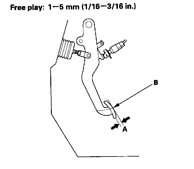 1. With the ignition switch OFF, inspect the pedal free play (A) on the pedal pad (B) by pushing the pedal by hand. If the brake pedal free play is insufficient, it may result in excessive brake drag.