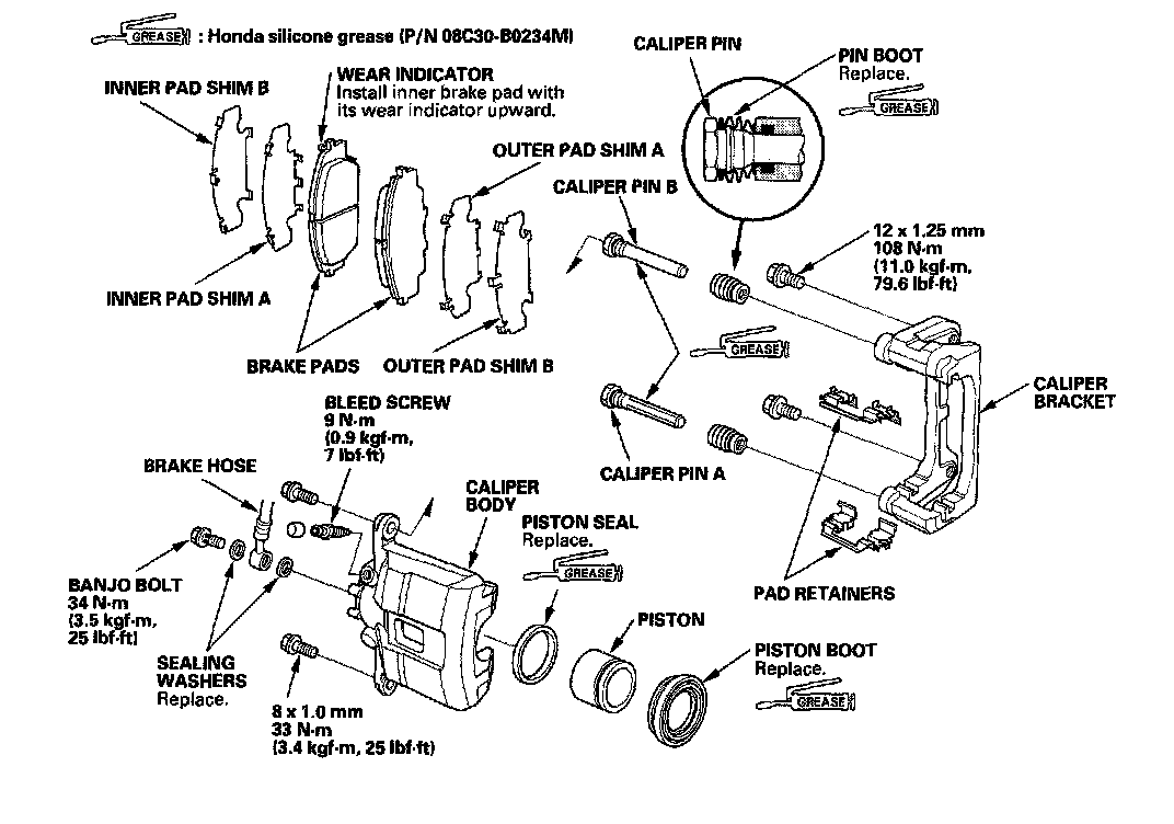 NOTE: Make sure that the caliper pins are installed correctly. Upper caliper pin B and lower caliper pin A are different. If the these caliper pins are installed in the wrong location, it will cause vibration, uneven or rapid brake pad wear, and possibly uneven tire wear.