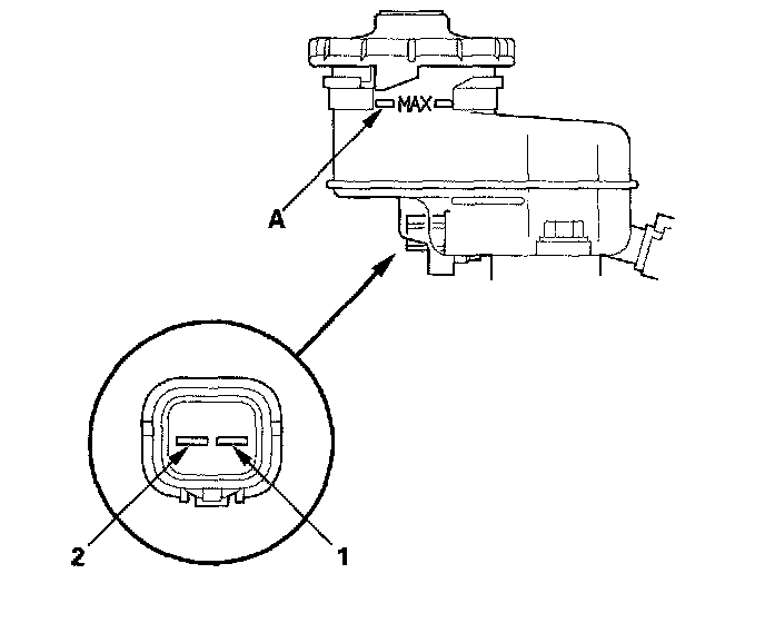 ^ Fill the reservoir with brake fluid to the MAX (upper) level (A). With the float up, there should be no continuity.