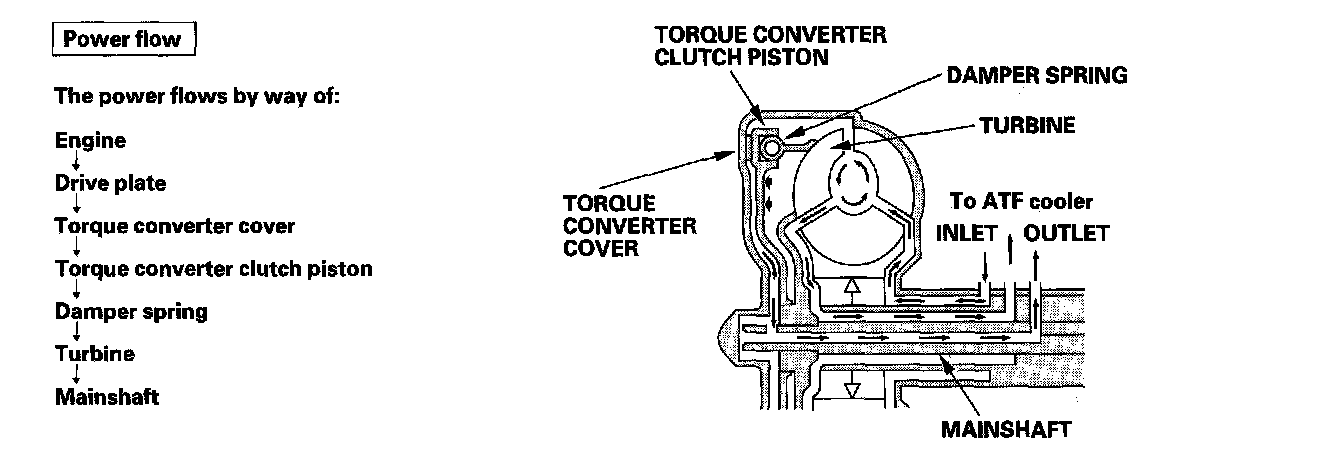 Lock-up SystemThe lock-up mechanism of the torque converter clutch operates in the D position (2nd, 3rd, 4th, and 5th) and D3 position (2nd and 3rd). The pressurized fluid is drained from the back of the torque converter through a fluid passage, causing the torque converter clutch piston to be held against the torque converter cover. As this takes place, the mainshaft rotates at the same speed as the engine crankshaft. Together with the hydraulic control, the PCM optimizes the timing and amount of the lock-up mechanism. When shift solenoid valve D is turned on by the PCM, shift solenoid valve D pressure switches the lock-up shift valve lock-up on and off. A/T clutch pressure control solenoid valve A and the lock-up control valve control the amount of lock-up.