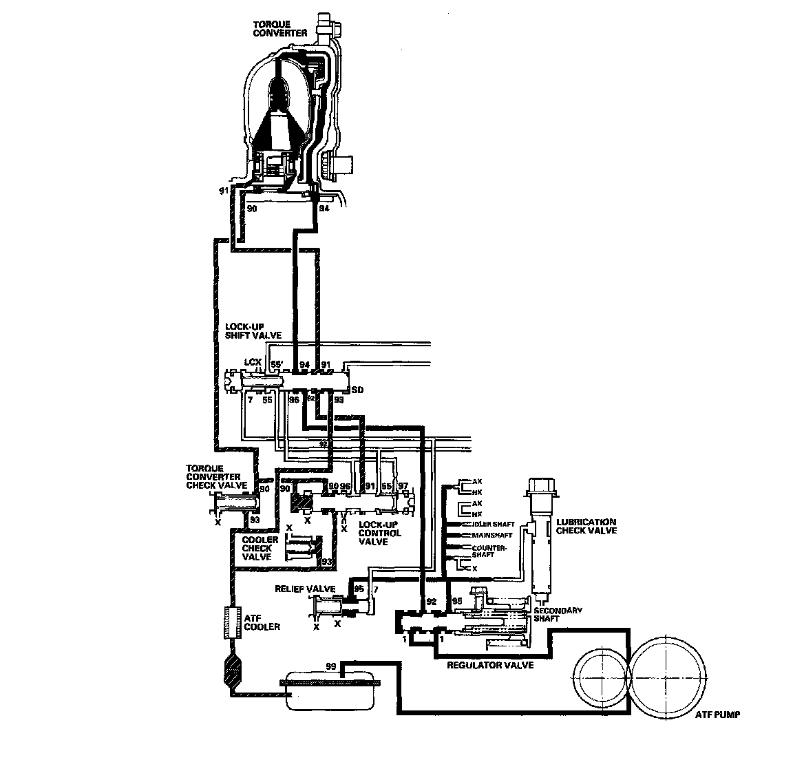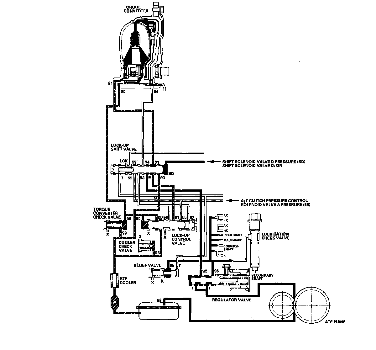 When the vehicle speed further increases, the PCM controls A/T clutch pressure control solenoid valve A to increase A/T clutch pressure control solenoid valve A pressure (55). A/T clutch pressure control solenoid valve A pressure (55) is applied to the lock-up control valve, and the lock-up control valve is moved to the left side to release torque converter back pressure (94). Torque converter pressure (91) enters into the front of the torque converter, and the torque converter clutch piston is engaged with the torque converter cover securely by torque converter pressure. Under this condition, torque converter back pressure is released fully, causing the torque converter clutch to be fully engaged; this condition is full lock-up.