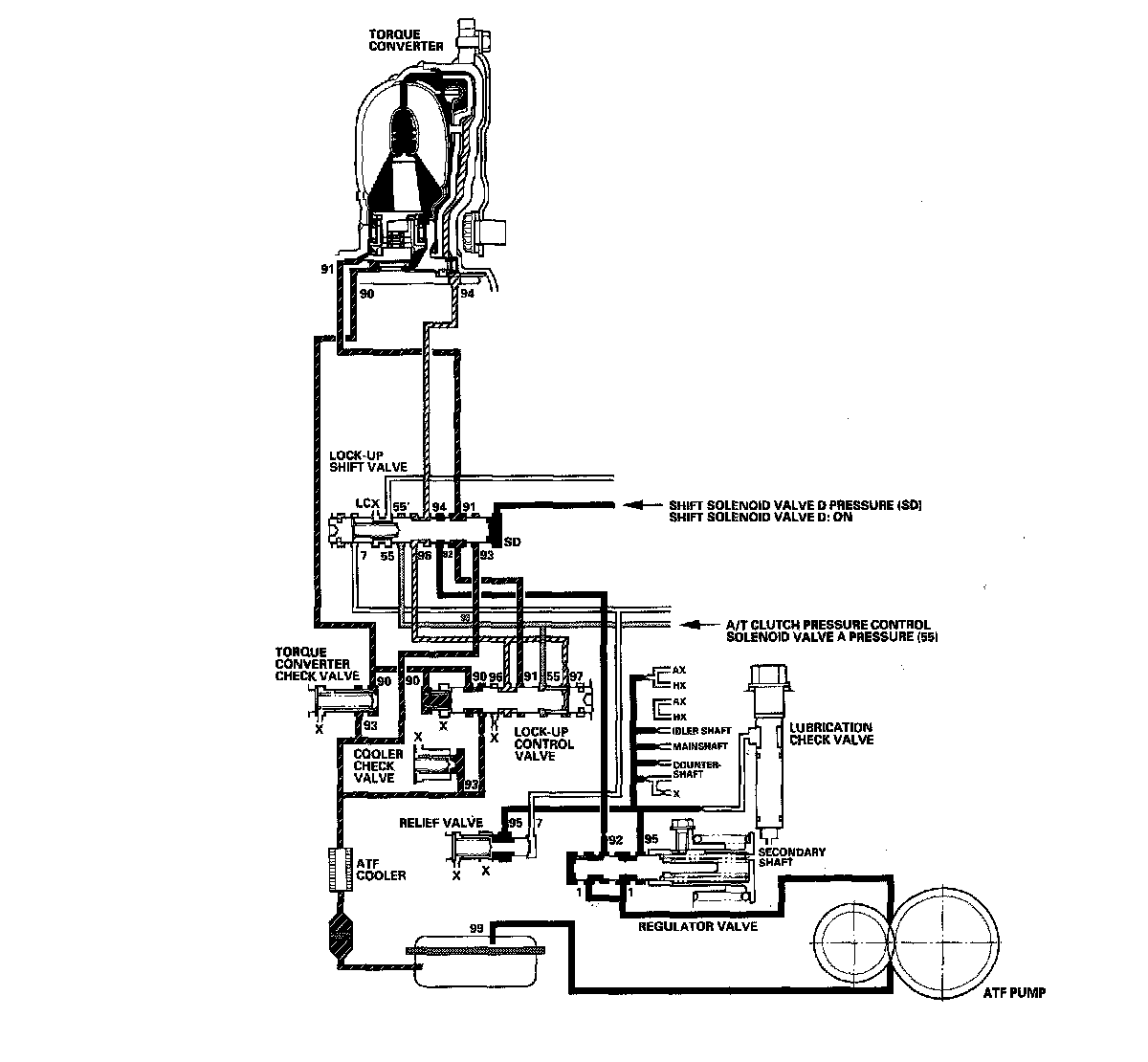 As the speed of the vehicle reaches the programmed value, the PCM turns shift solenoid valve D ON. Shift solenoid valve D pressure (SID) is applied to the right end of the lock-up shift valve to switch the torque converter pressure port leading to front of the torque converter. Torque converter pressure (91) enters into the front of the torque converter to engage the torque converter clutch piston. The PCM also controls A/T clutch pressure control solenoid valve A to regulate A/T clutch pressure control solenoid valve A pressure (55), and A/T clutch pressure control solenoid valve A pressure (55) is applied to the lock-up control valve. Torque converter pressure (94) drained from the back of the torque converter is applied to the right side of the lock-up control valve, and torque converter pressure (90) is applied to the left side of the lock-up control valve. The lock-up control valve controls the amount of the lock-up by receiving these pressures. The torque converter clutch is engaged partially during torque converter pressure (90) in the left side of the lock-up control valve is higher, and the torque converter clutch is engaged securely according to amount of pressure in the right side of the lock-up control valve. Under this condition, the torque converter clutch is engaged by pressure entering into the front side of the torque converter; this condition is partial lock-up.