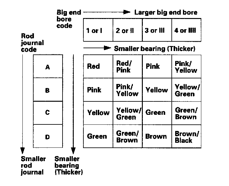 4. Use the big end bore codes and rod journal codes to select the appropriate replacement bearings from the following table.