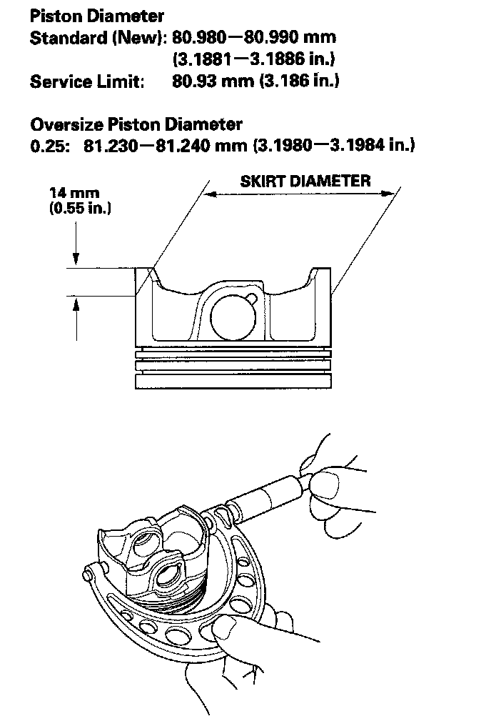 3. Measure the piston diameter at a point 14 mm (0.55 in.) from the bottom of the skirt.