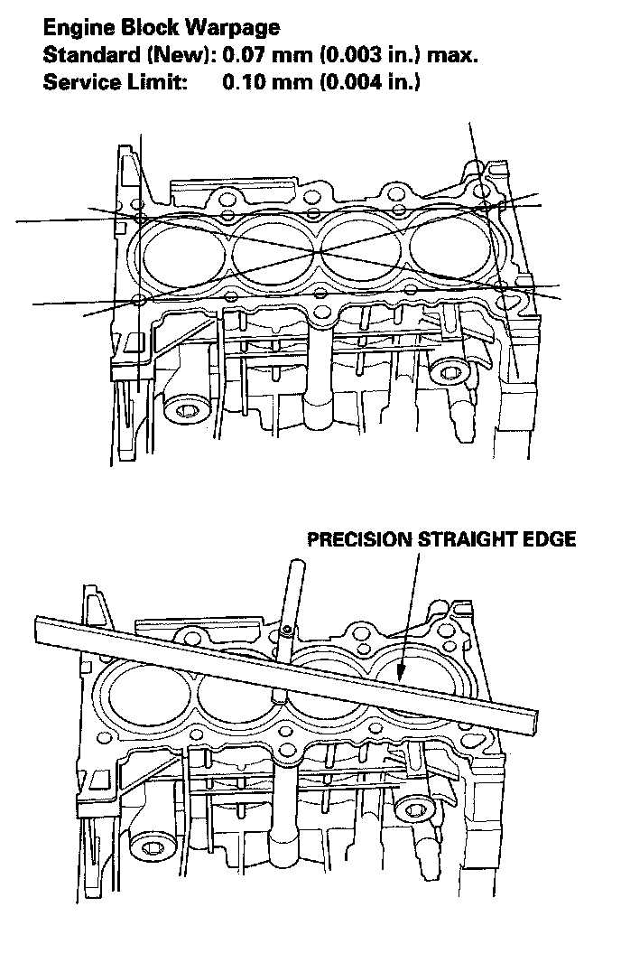 6. Check the top of the engine block for warpage. Measure along the edges, and across the center as shown.