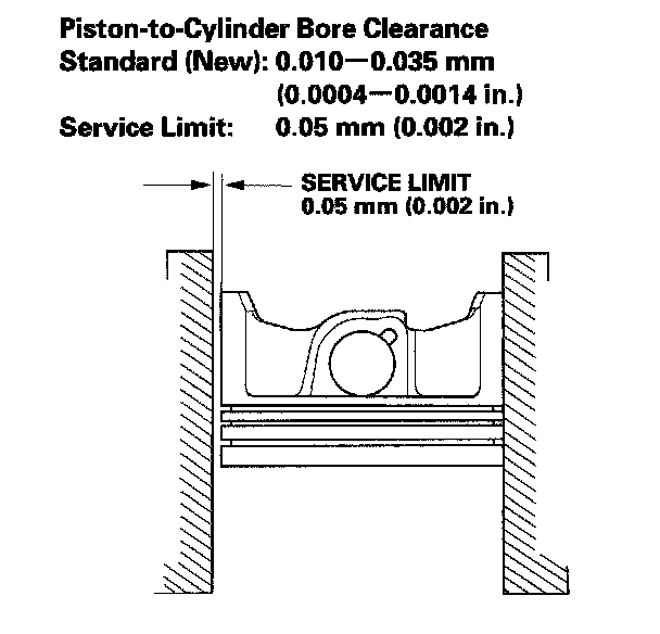 7. Calculate the difference between the cylinder bore diameter and the piston diameter. If the clearance is near, or exceeds the service limit, inspect the piston and engine block for excessive wear.