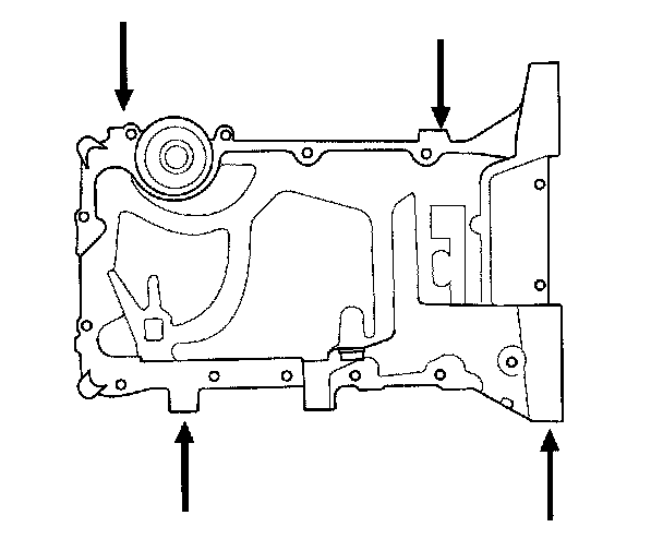 17. Using a flat blade screwdriver, separate the oil pan from the block in the places shown.